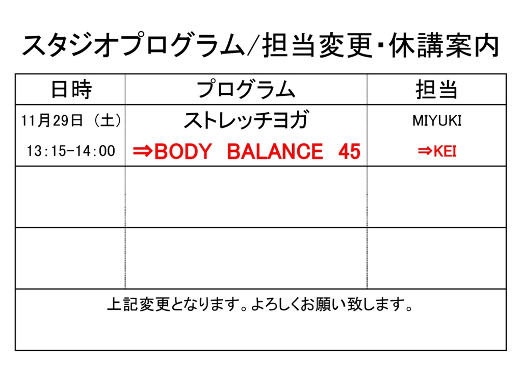 11月スタジオプログラム変更のお知らせ(2) 2025 11/25 お知らせ 2025年11月25日 11月29日(土)のスタジオプログラムに一部変更がありました。 下記の通りとなりますので、ご確認お願いします。 お知らせ