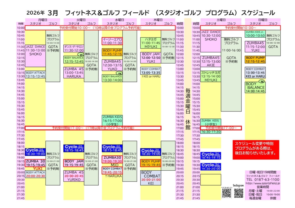 尚、休講・変更のご案内は、インスタグラムやホームページ内のお知らせ欄、館内掲示等が最新となります。