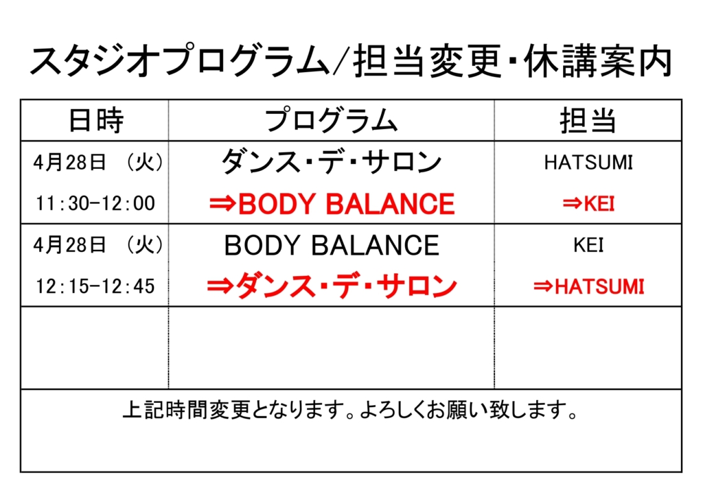 4月28日(火)のスタジオプログラムは以下の変更があります。